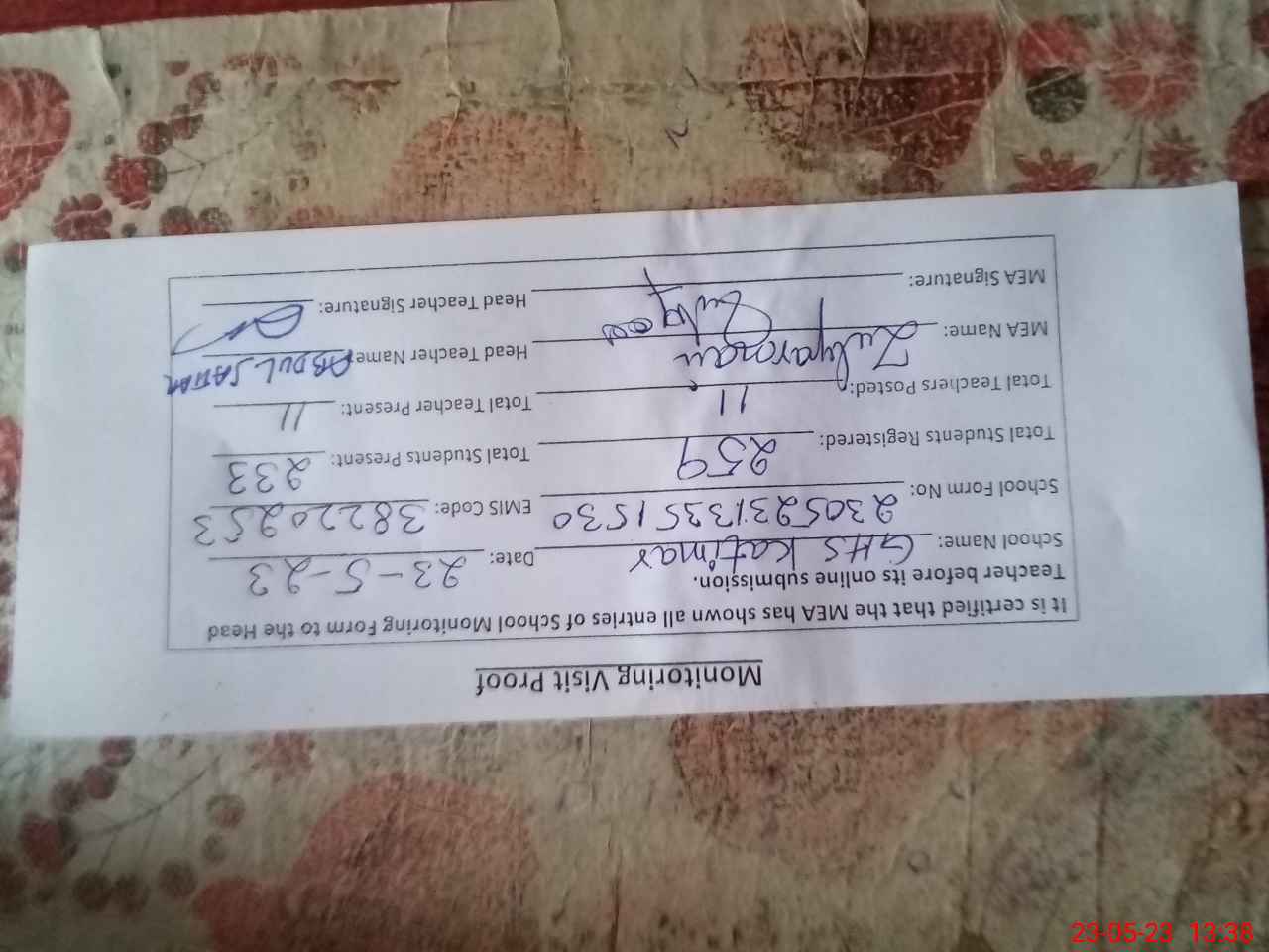 | Attendance Register | Head Teacher | MEA with School | Visit Proof |