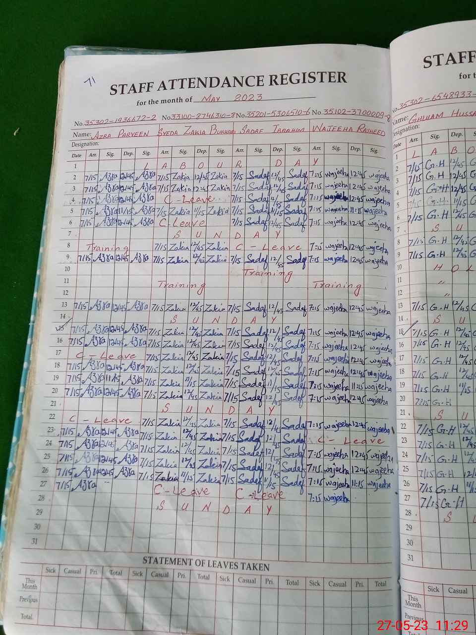 | 33**** | Sy**** Za**** Bu**** | PST | Regular | 1 | 0 | 3 | 0 | 0 | 0 | 0 | 0 | 1 | Casual |