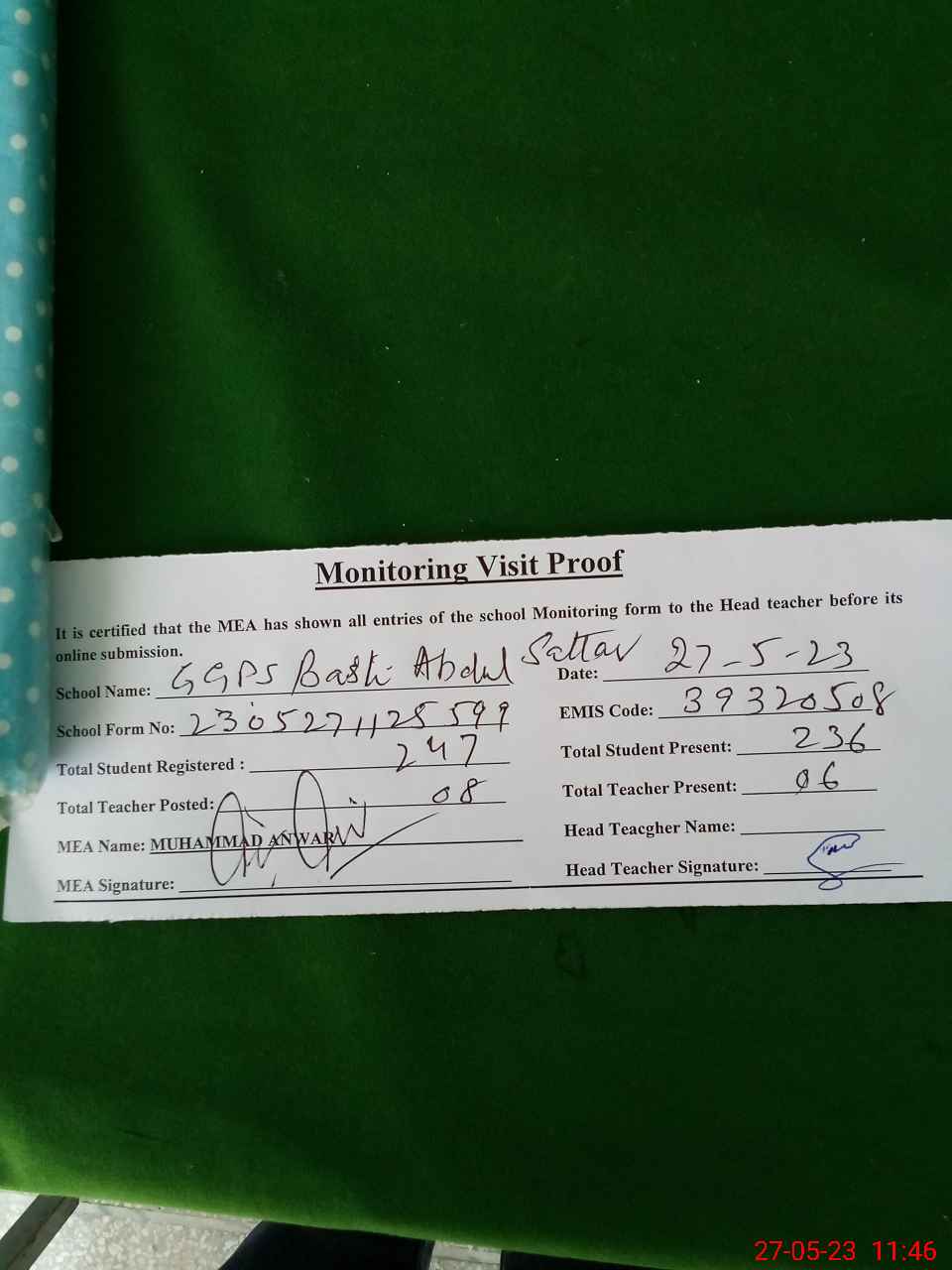 | Attendance Register | Head Teacher | MEA with School | Visit Proof |