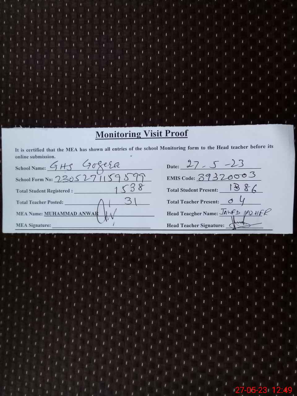 | Attendance Register | Head Teacher | MEA with School | Visit Proof |