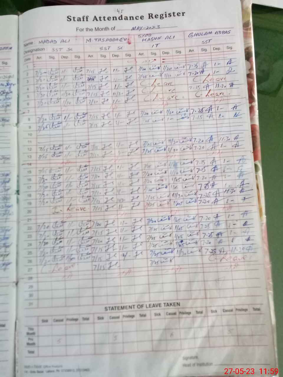 | CNIC | Full Name | Designation | R/C | Absence During Last Calender Month |