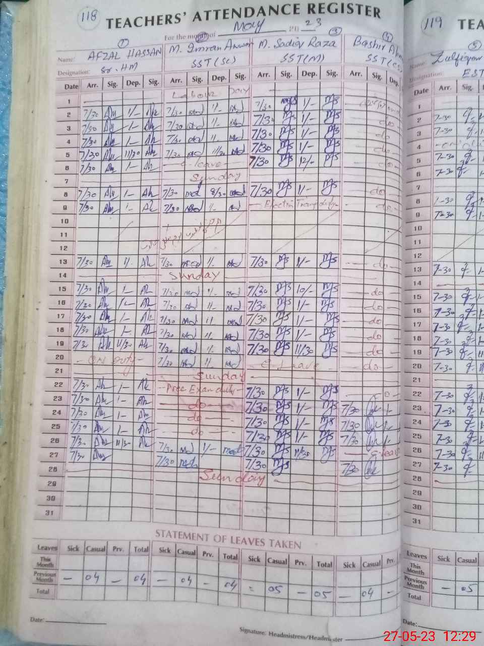 | 33**** | Sy**** Ta**** Ab**** Sh**** | PST | Regular | 0 | 0 | 0 | 0 | 0 | 0 | 0 | 0 | 0 | Exam Duty |