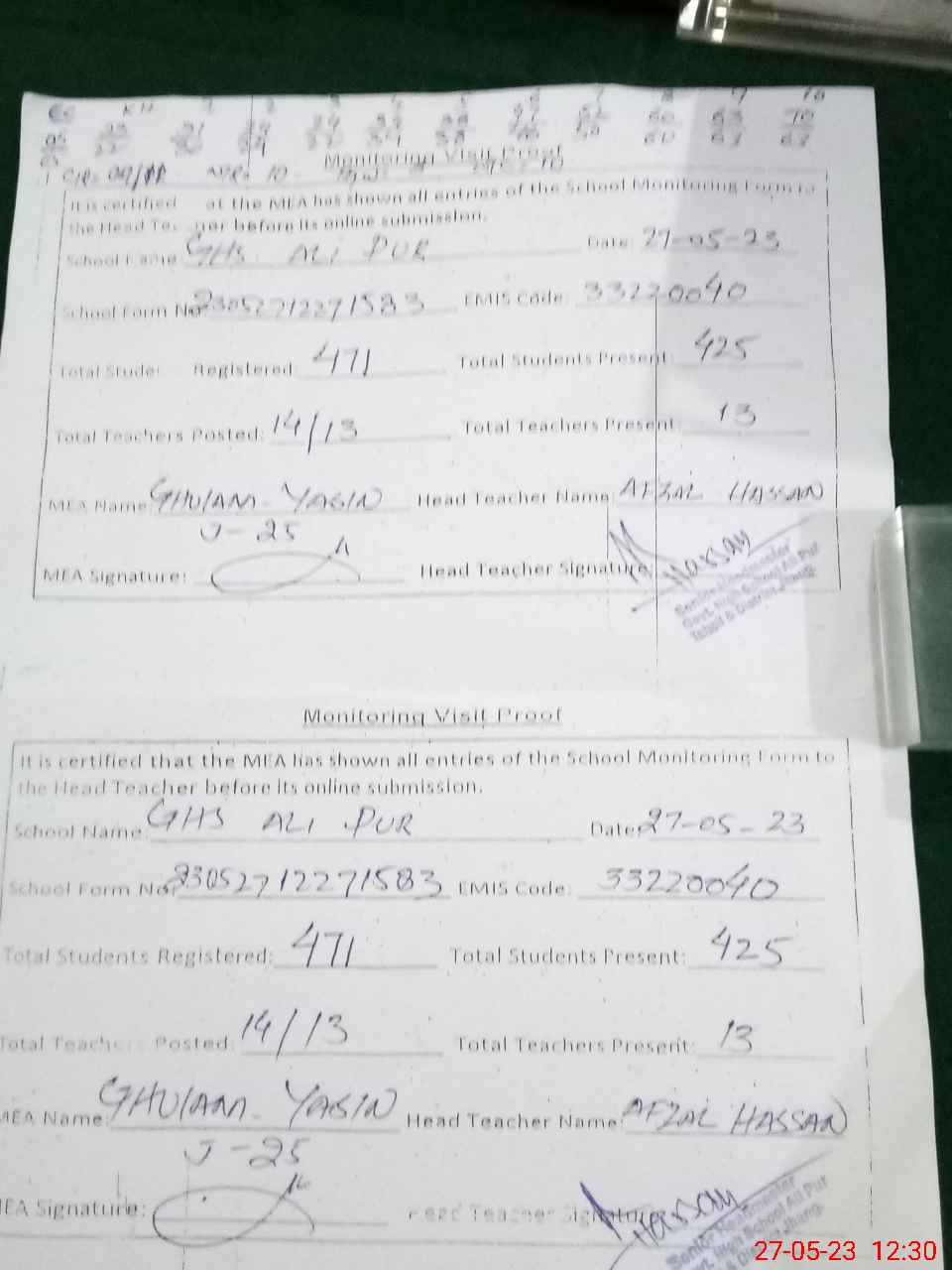 | EMIS Code: 33220040 | Name of School: GHS ALI PUR | |||