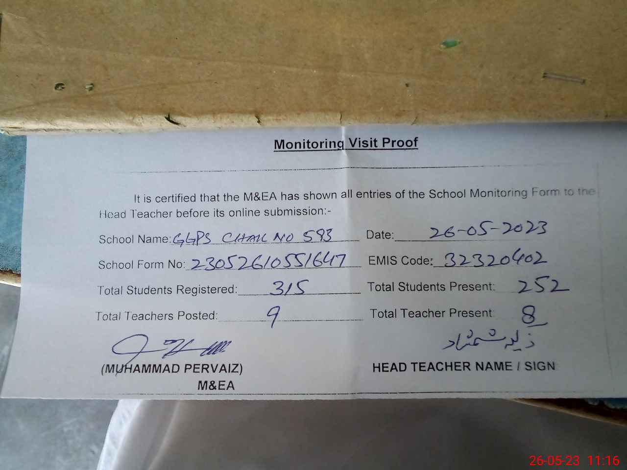 | Attendance Register | Head Teacher | MEA with School | Visit Proof |