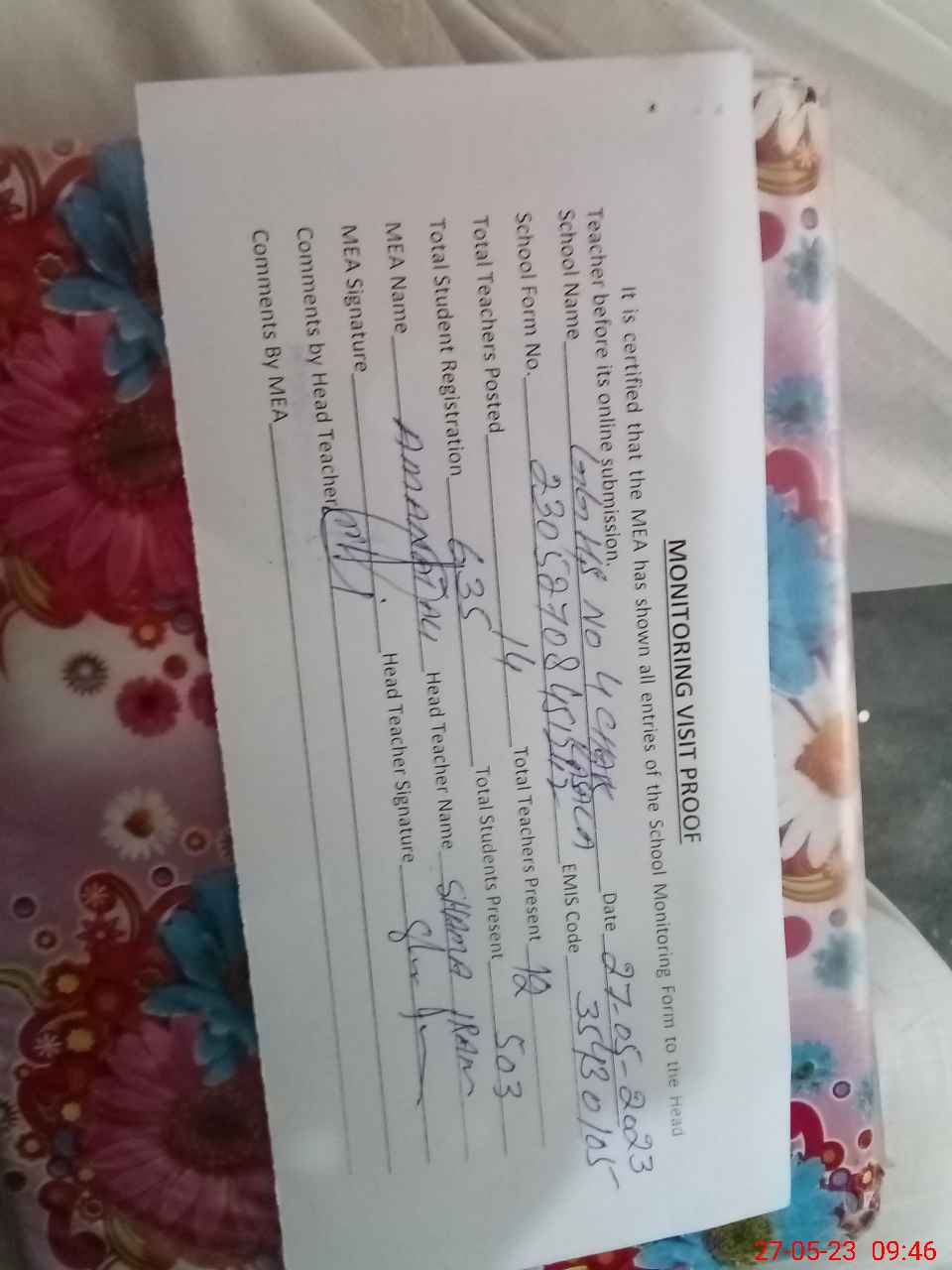 | Attendance Register | Head Teacher | MEA with School | Visit Proof |