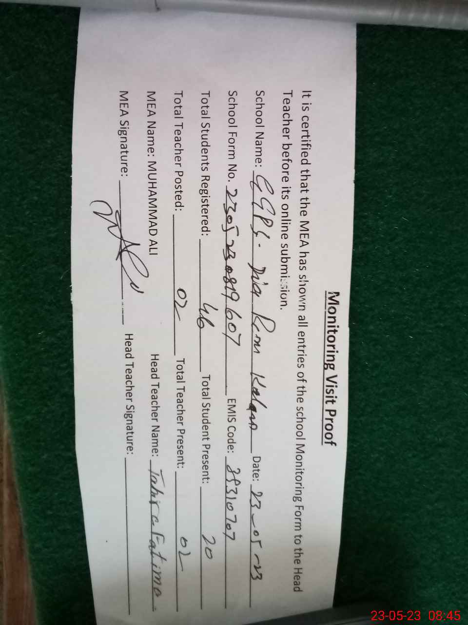 | Attendance Register | Head Teacher | MEA with School | Visit Proof |