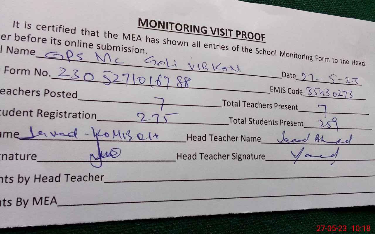 | Attendance Register | Head Teacher | MEA with School | Visit Proof |