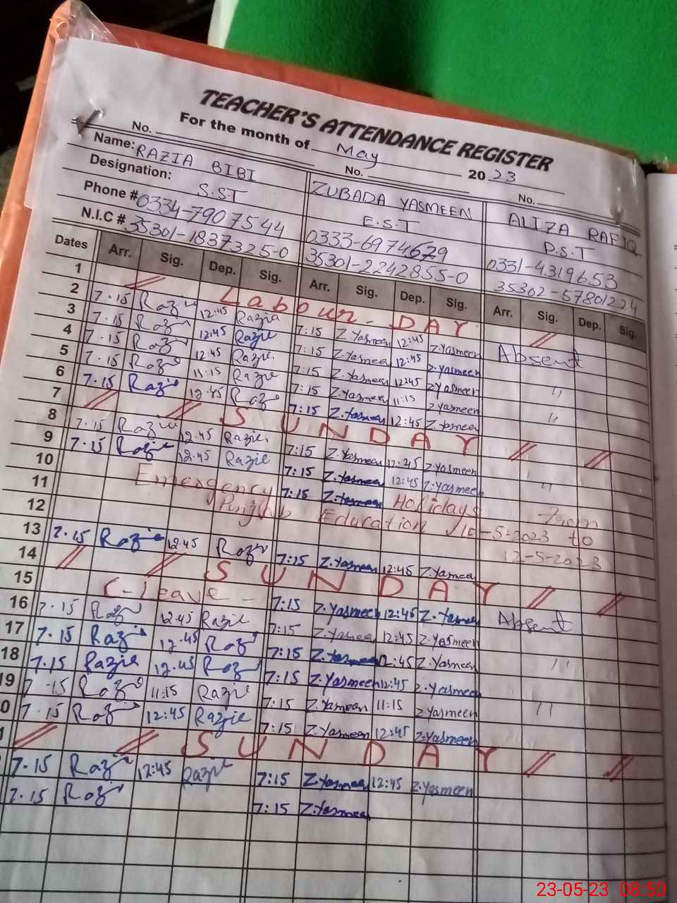| CNIC | Full Name | Designation | R/C | Absence During Last Calender Month |