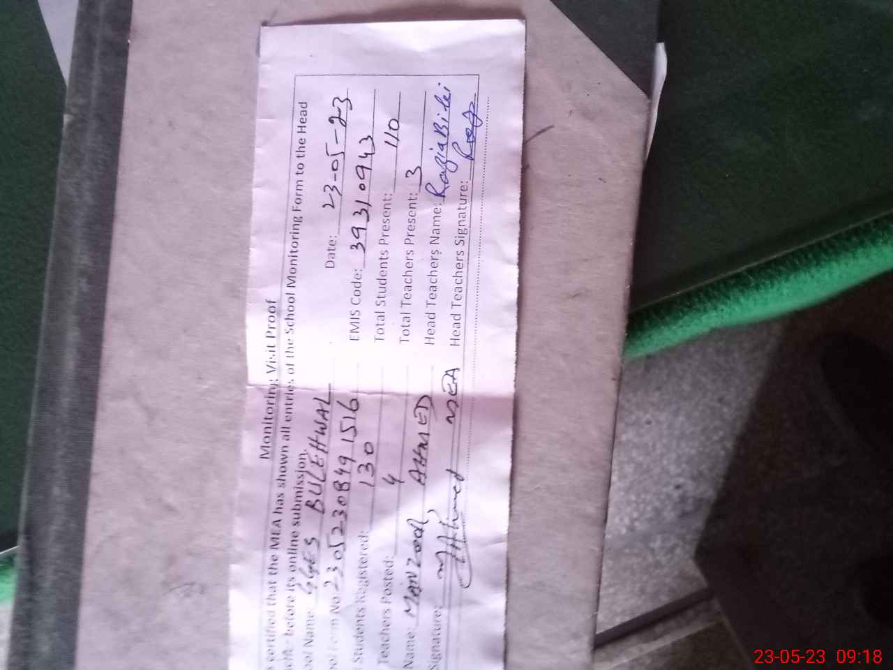 | Attendance Register | Head Teacher | MEA with School | Visit Proof |