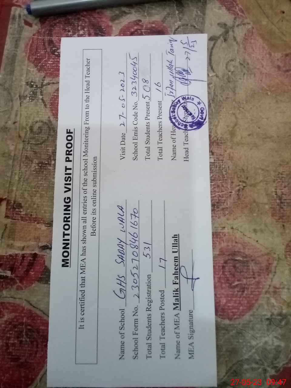 | EMIS Code: 32340045 | Name of School: GHS SABAY WALA | |||