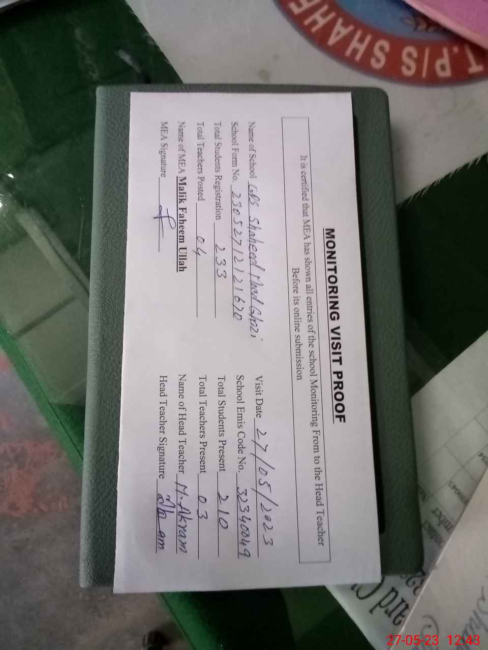 | Attendance Register | Head Teacher | MEA with School | Visit Proof |