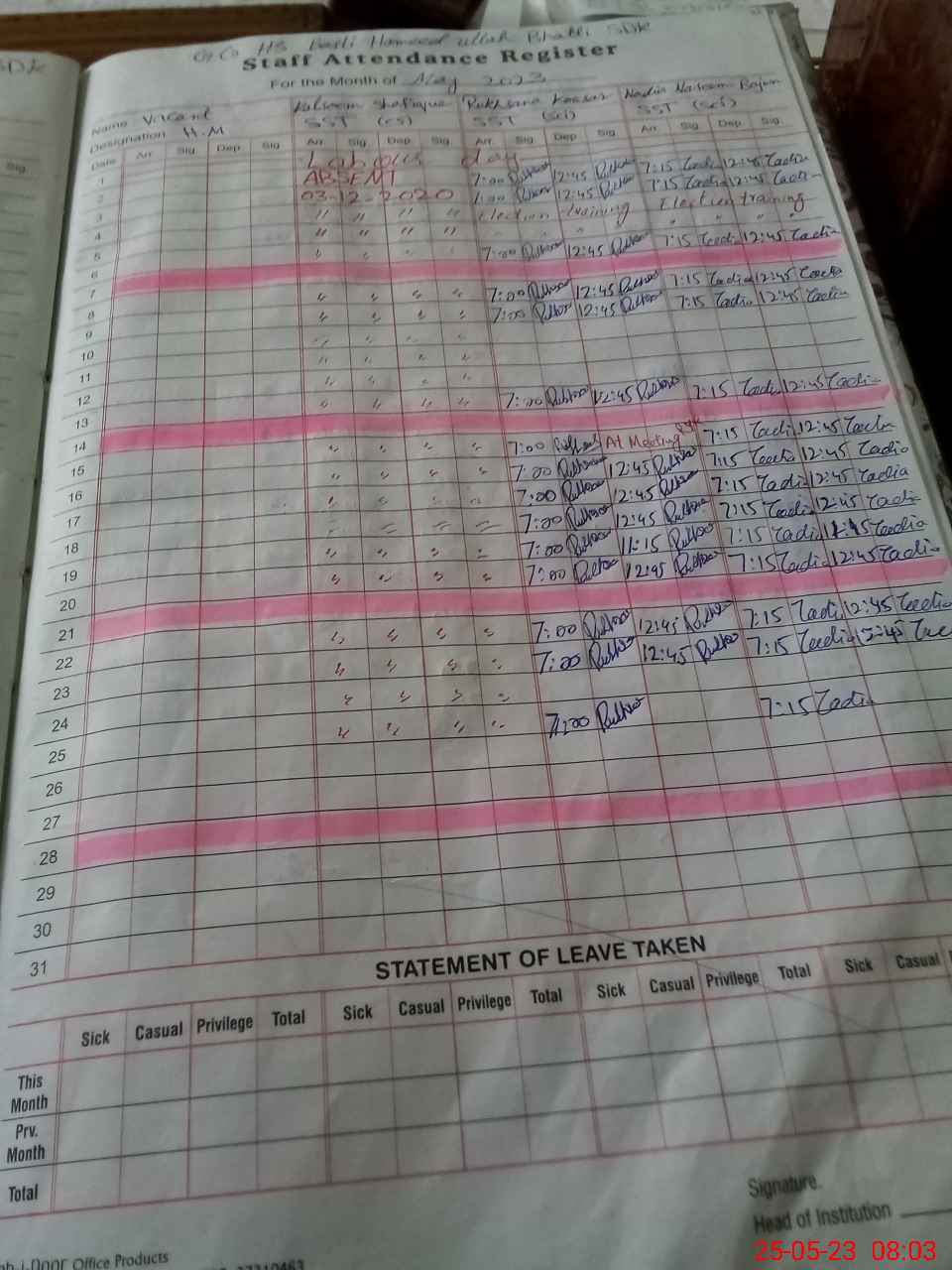 | Attendance Register | Head Teacher | MEA with School | Visit Proof |