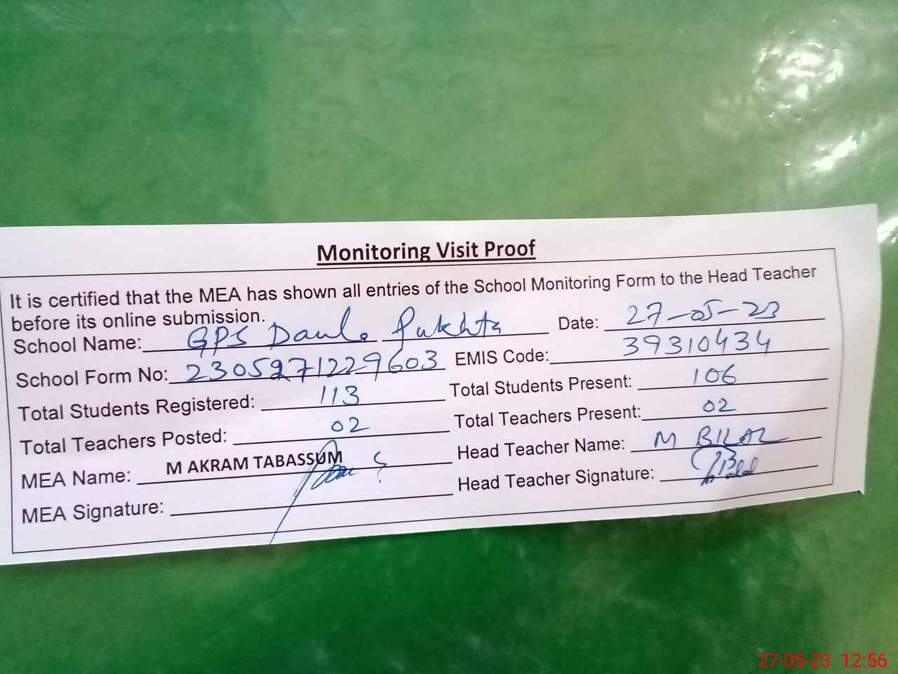 | Attendance Register | Head Teacher | MEA with School | Visit Proof |