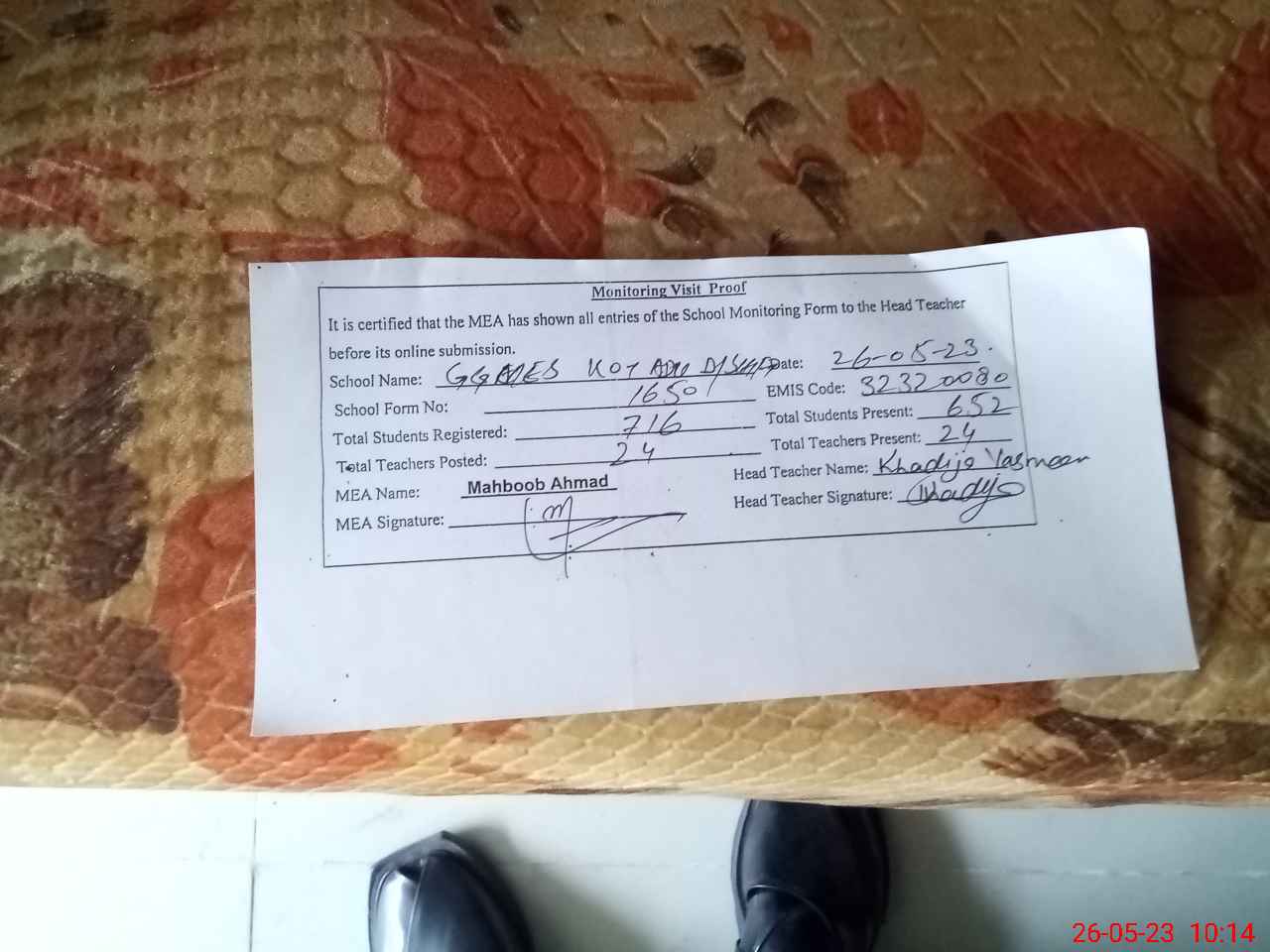 | Certified that this School was Inspected by the Undersigned MEA/DMO Today and the Information Stated Above is as Per Record. | |||||