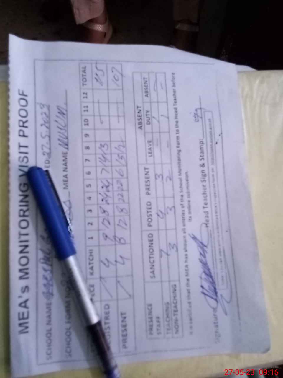 | Attendance Register | Head Teacher | MEA with School | Visit Proof |