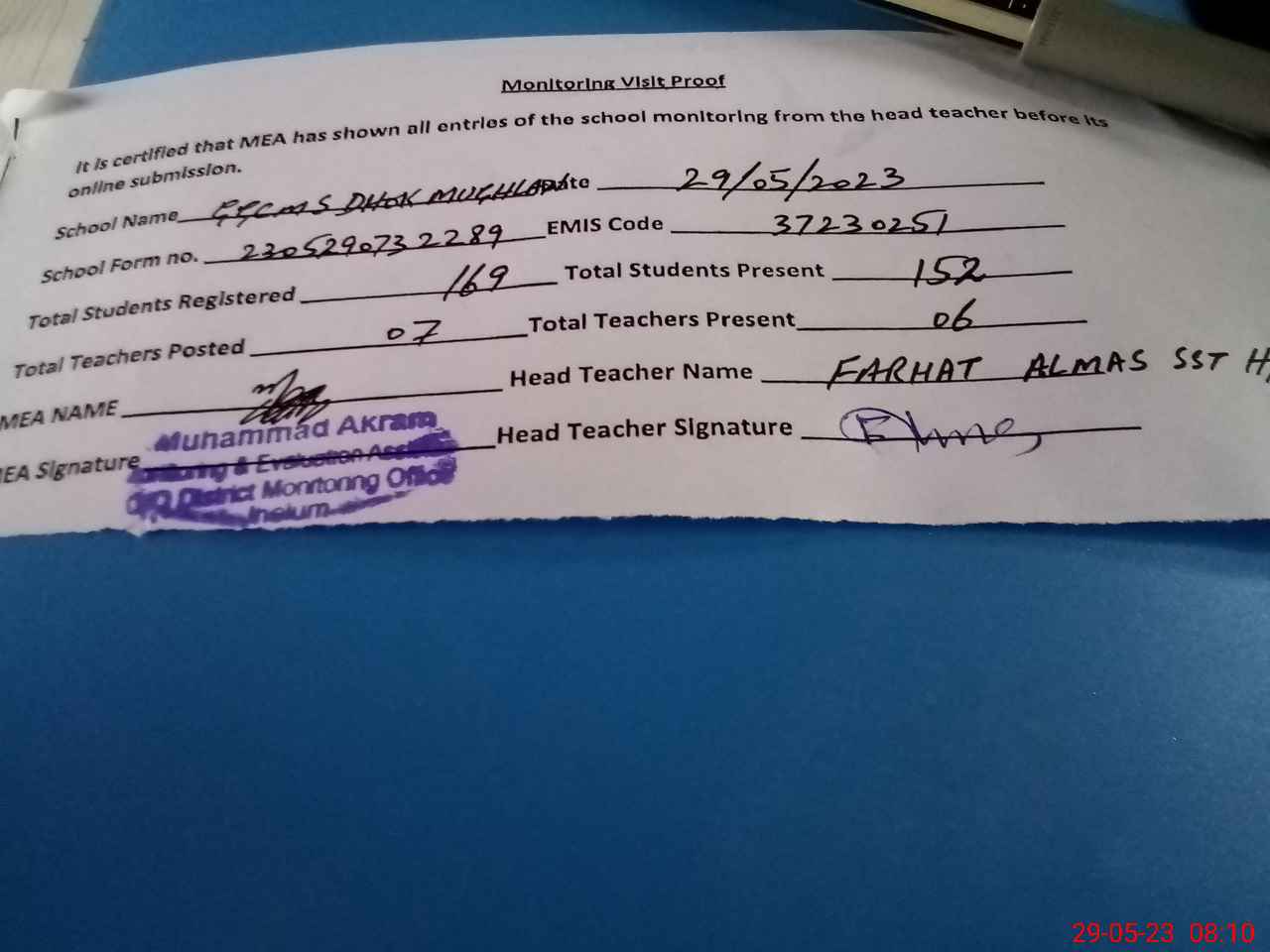 | Attendance Register | Head Teacher | MEA with School | Visit Proof |