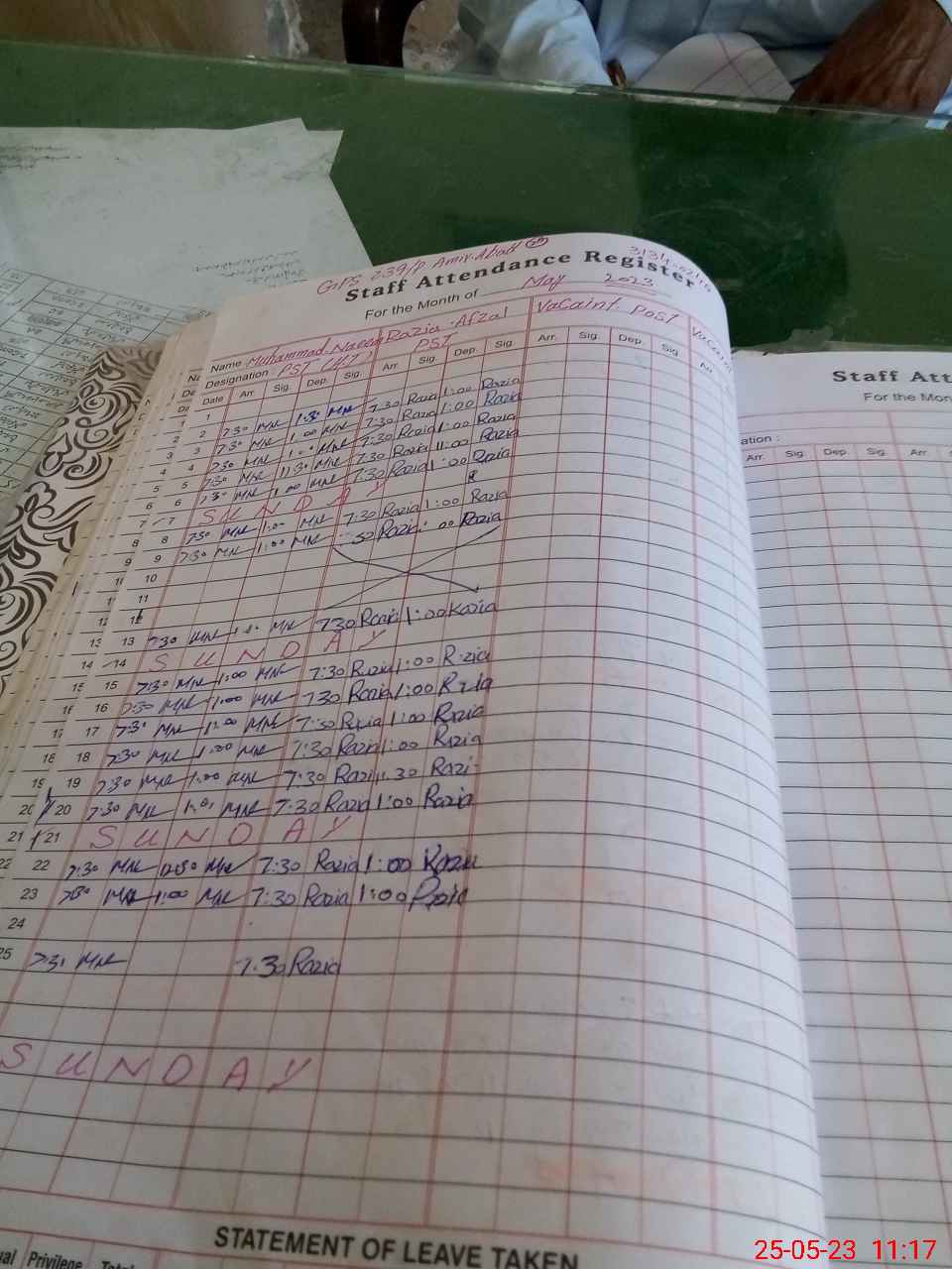 | CNIC | Full Name | Designation | R/C | Absence During Last Calender Month |