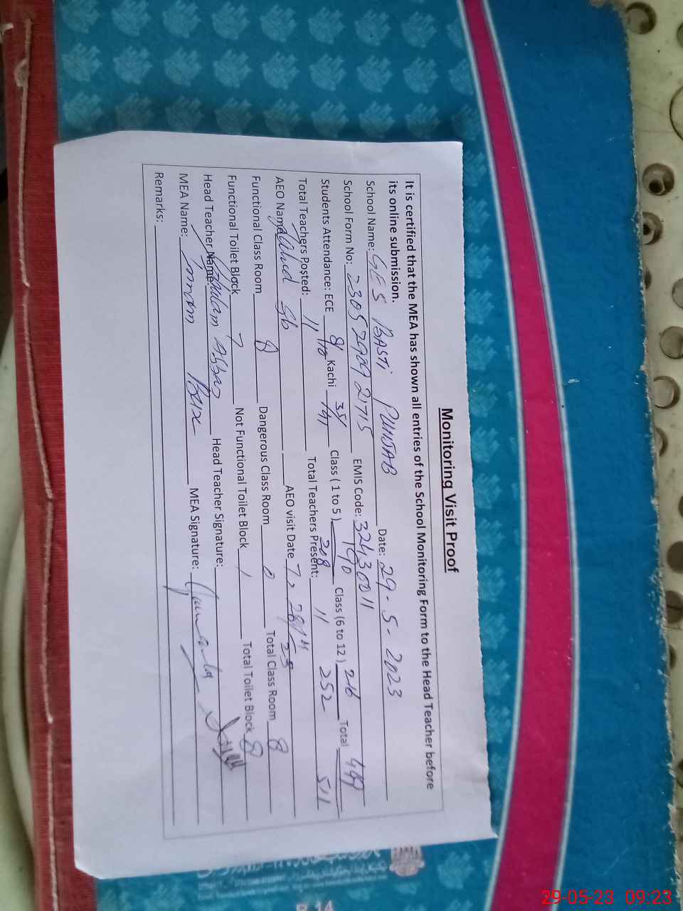 | Attendance Register | Head Teacher | MEA with School | Visit Proof |