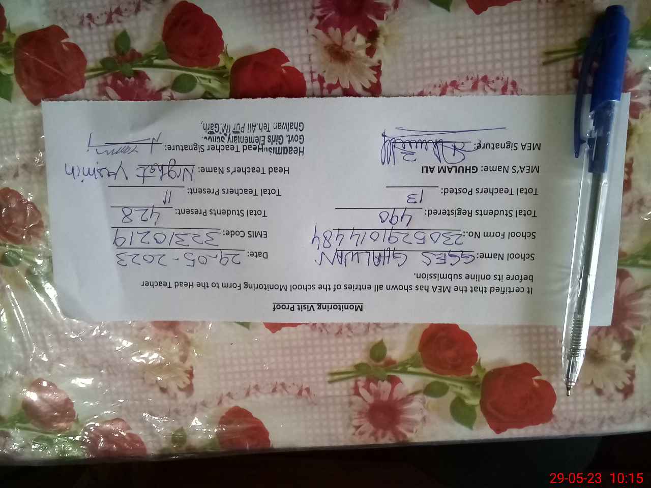 | Monitoring Date: 29-05-2023 | Start Time: 29-05-2023 09:17 AM | End Time: 29-05-2023 10:16 AM | Name of MEA: Gh**** Al**** | |