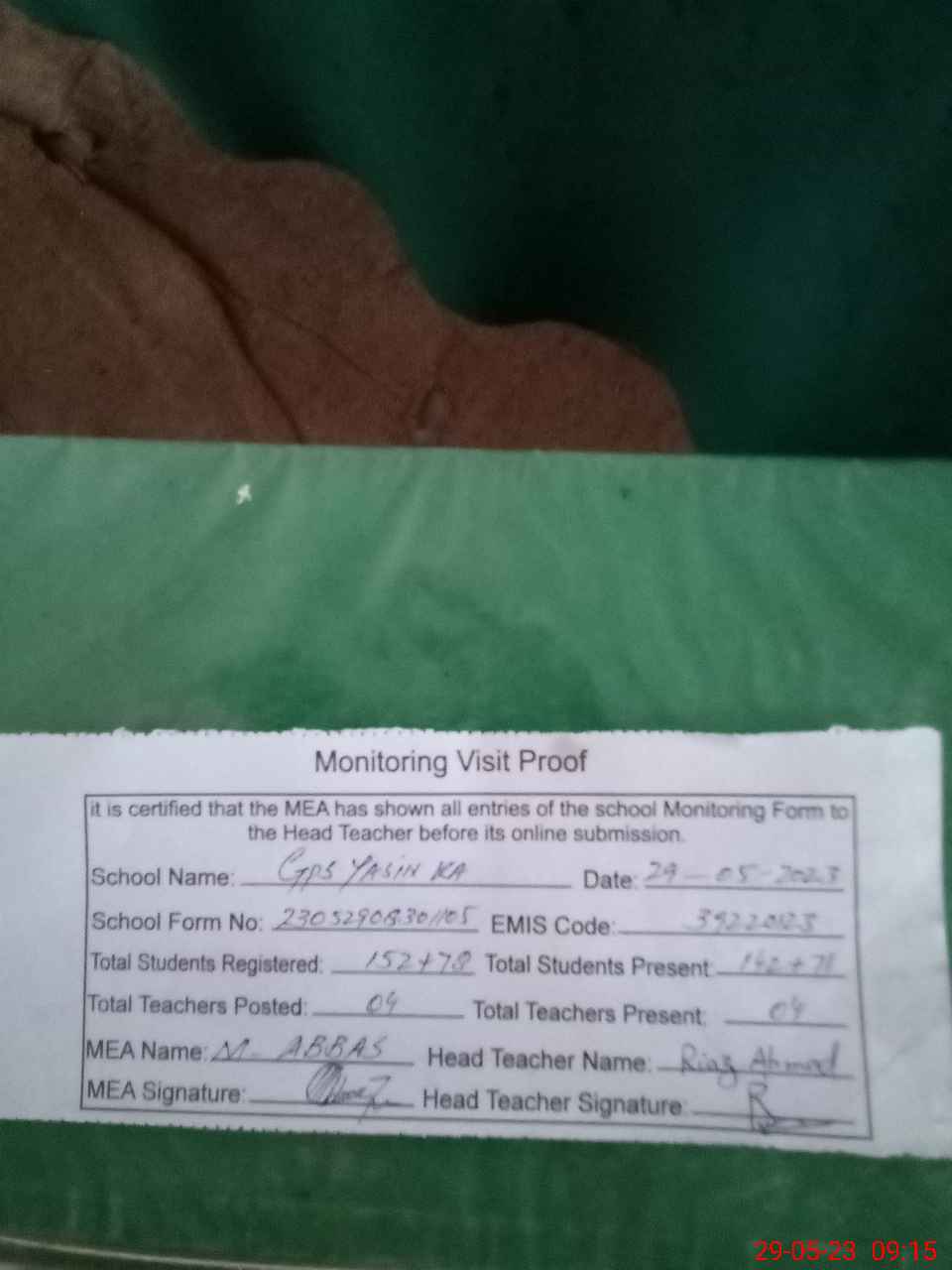 | Attendance Register | Head Teacher | MEA with School | Visit Proof |
