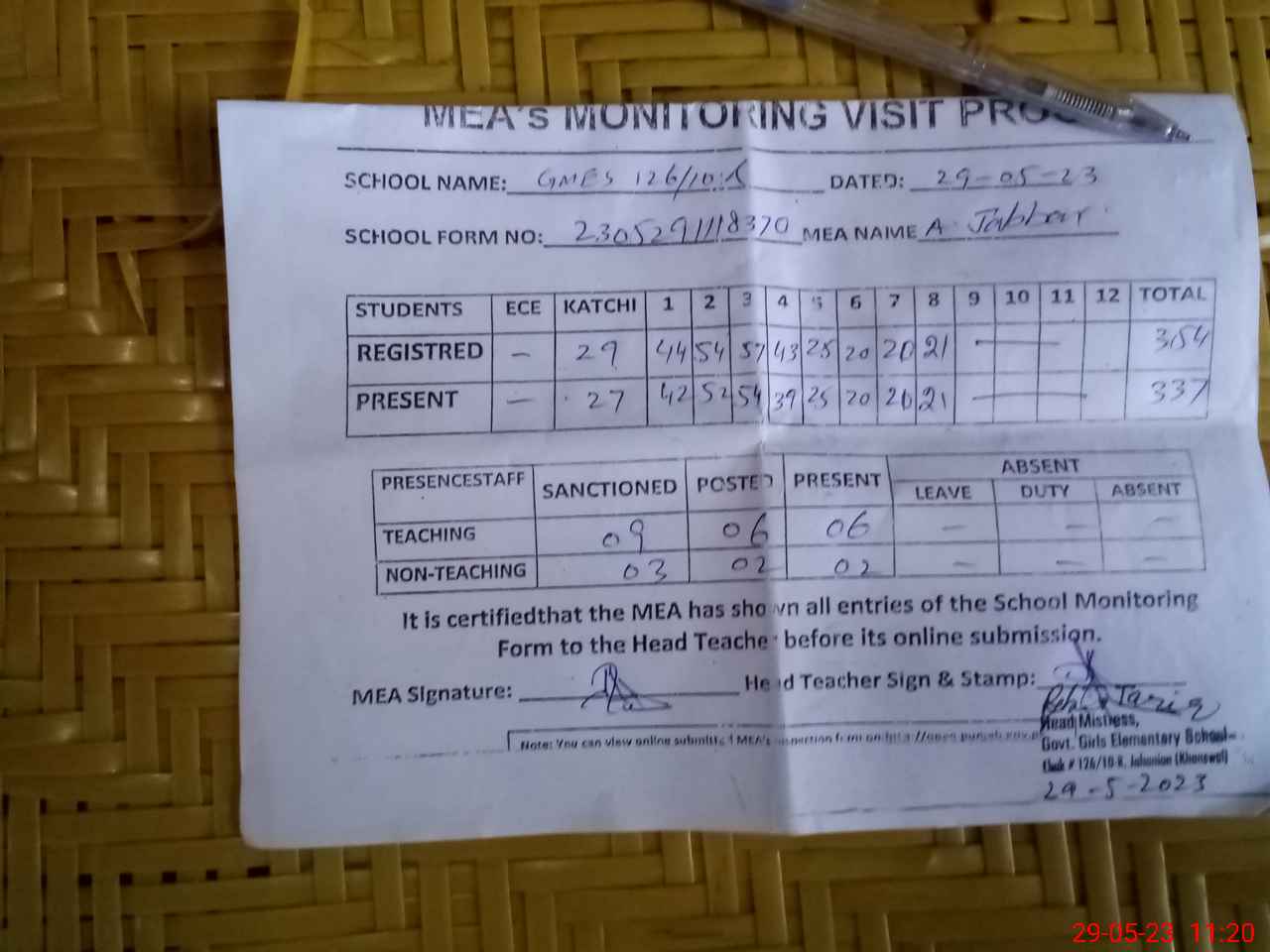 | Attendance Register | Head Teacher | MEA with School | Visit Proof |