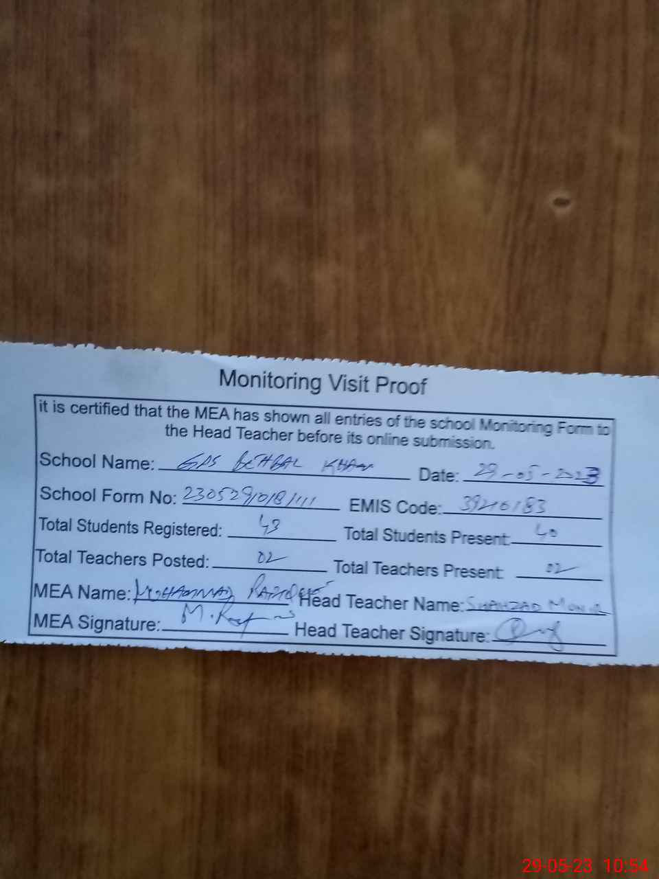 | Attendance Register | Head Teacher | MEA with School | Visit Proof |