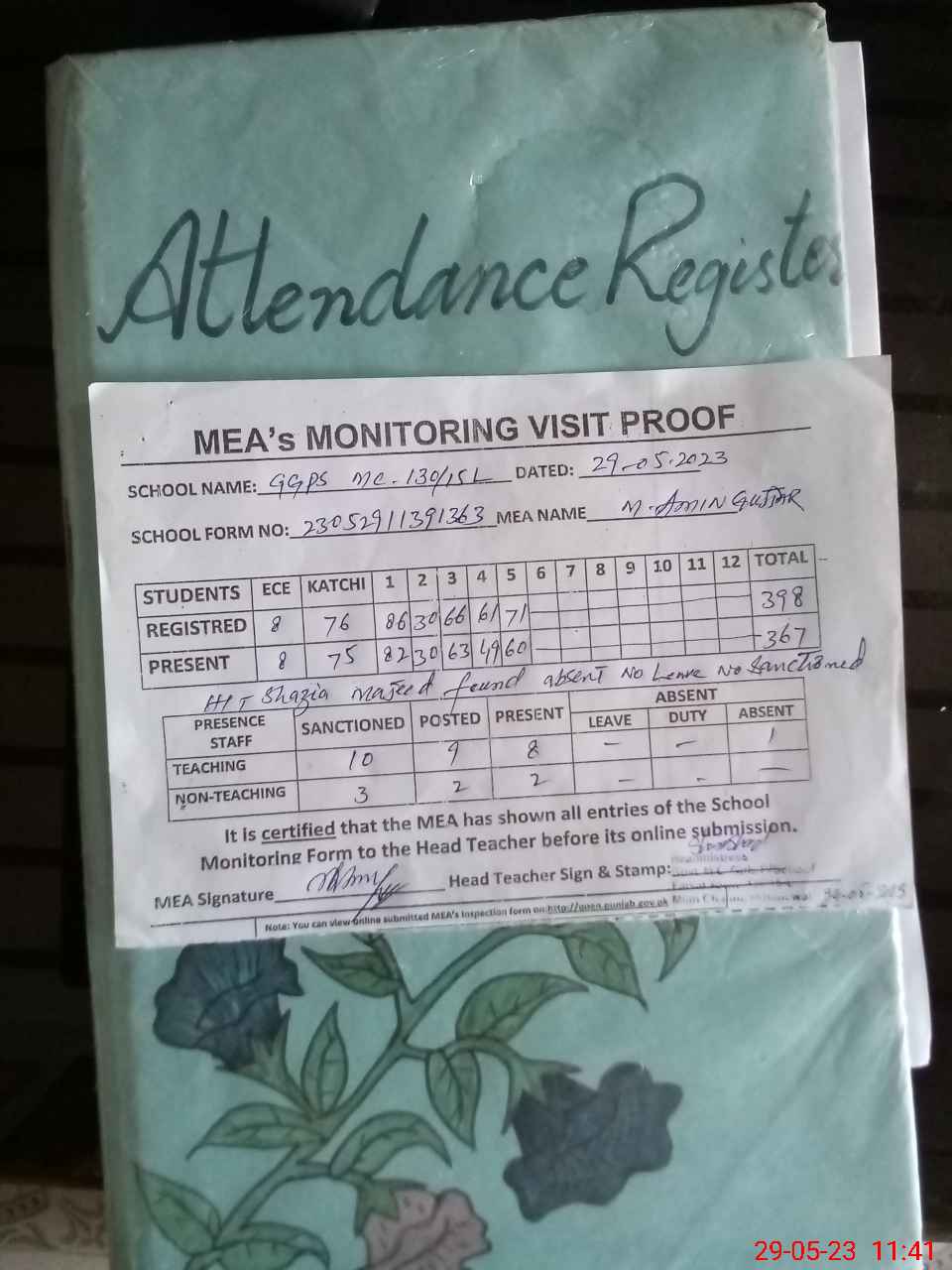 | Attendance Register | Head Teacher | MEA with School | Visit Proof |