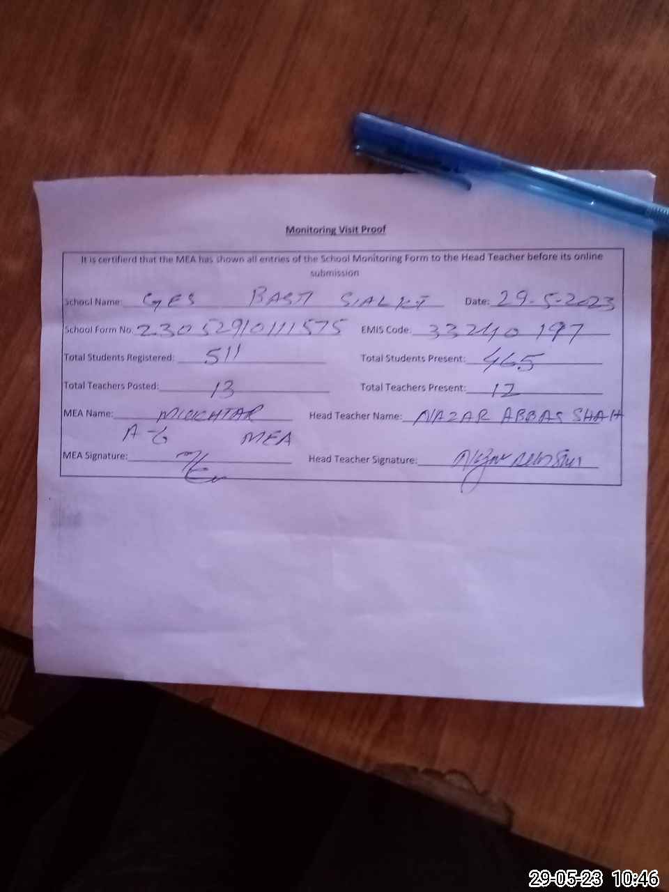 | Attendance Register | Head Teacher | MEA with School | Visit Proof |