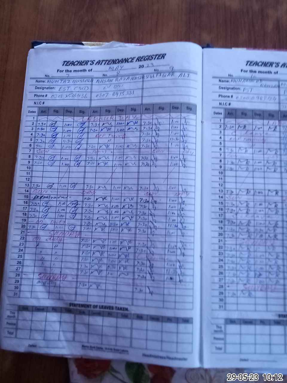 | CNIC | Full Name | Designation | R/C | Absence During Last Calender Month |