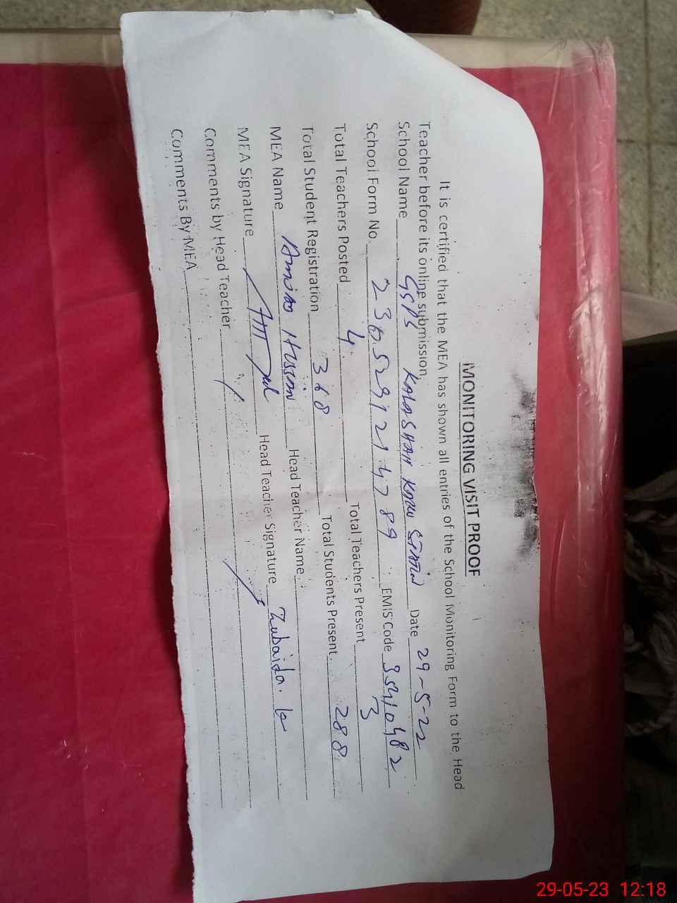 | Attendance Register | Head Teacher | MEA with School | Visit Proof |