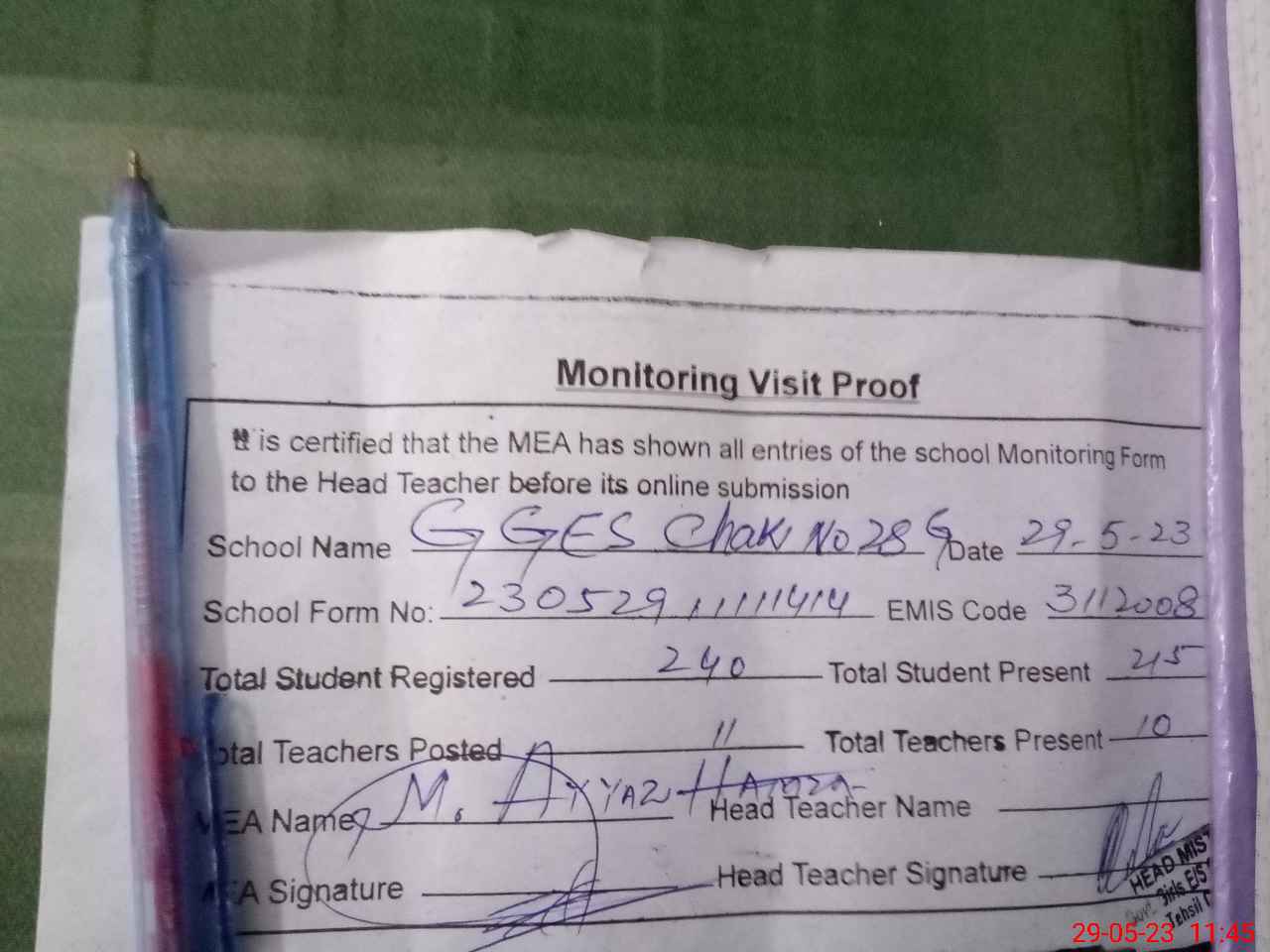 | Attendance Register | Head Teacher | MEA with School | Visit Proof |