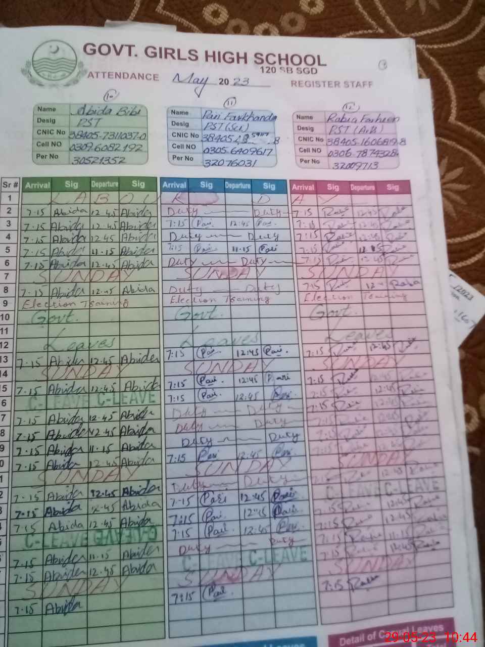 | CNIC | Full Name | Designation | R/C | Absence During Last Calender Month |