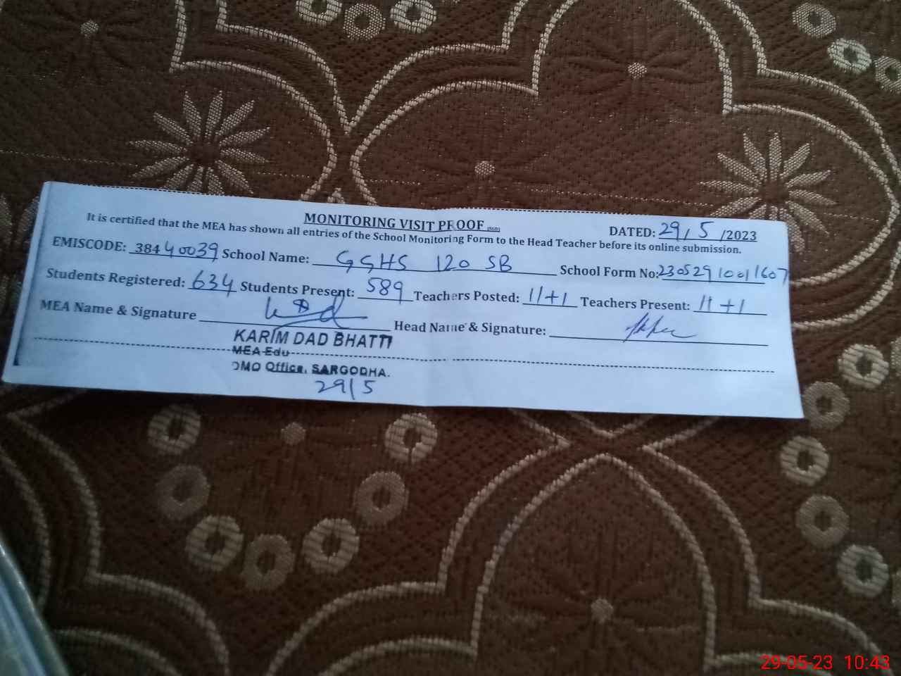| Name: Sa**** Za**** Me**** Designation: (School Headmaster's/Headmistress's) S.S.T.(Sci) Phone/Cell Number: 03**** |