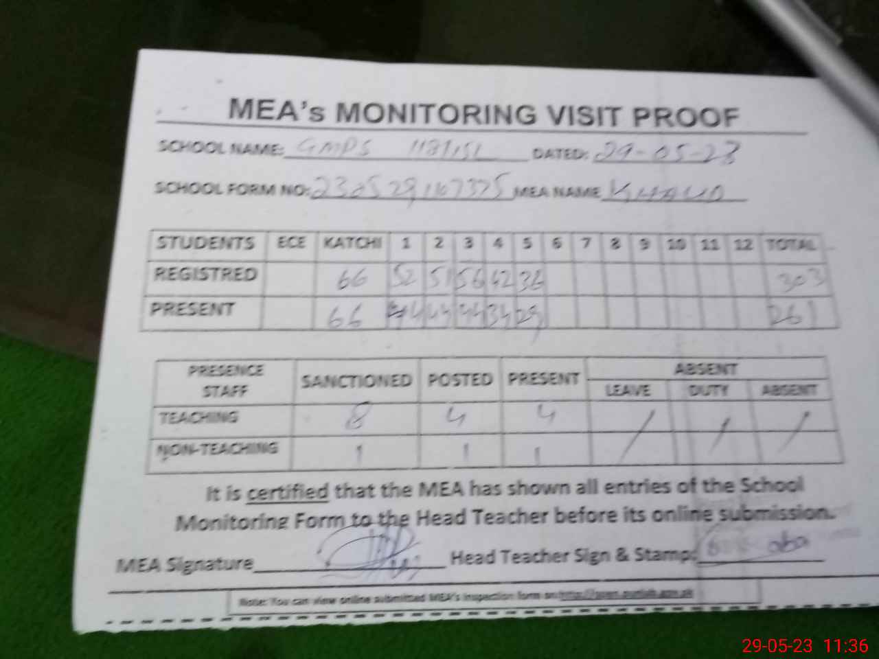 | Attendance Register | Head Teacher | MEA with School | Visit Proof |