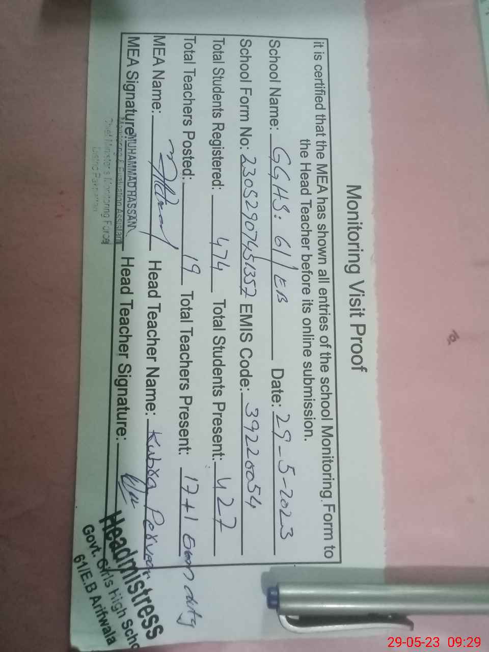 | Attendance Register | Head Teacher | MEA with School | Visit Proof |