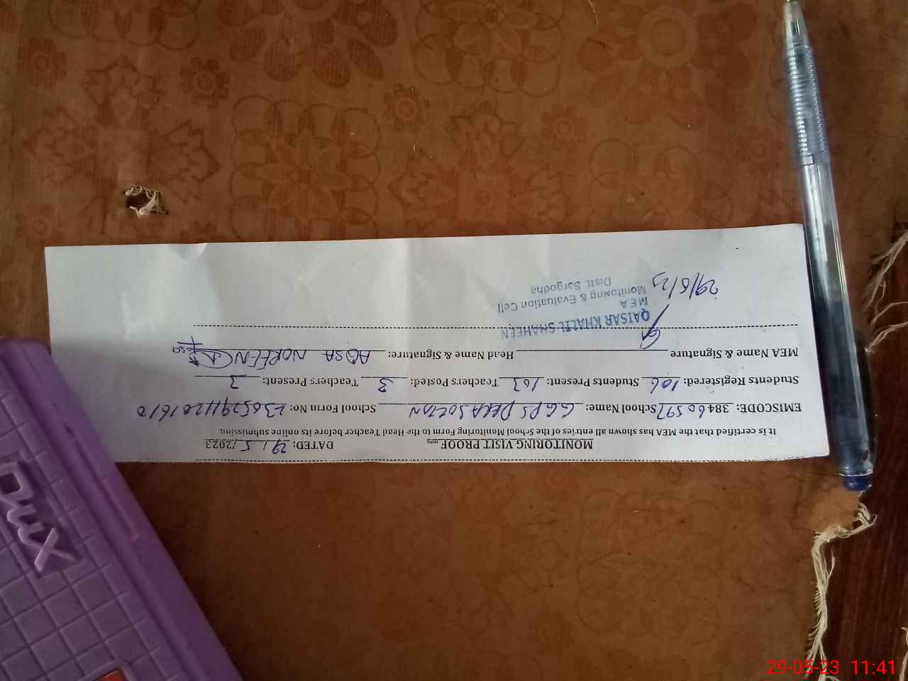 | Attendance Register | Head Teacher | MEA with School | Visit Proof |
