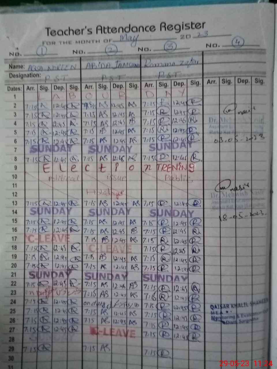 | Monitoring Date: 29-05-2023 | Start Time: 29-05-2023 11:20 AM | End Time: 29-05-2023 12:00 PM | Name of MEA: QA**** KH**** SH**** | |