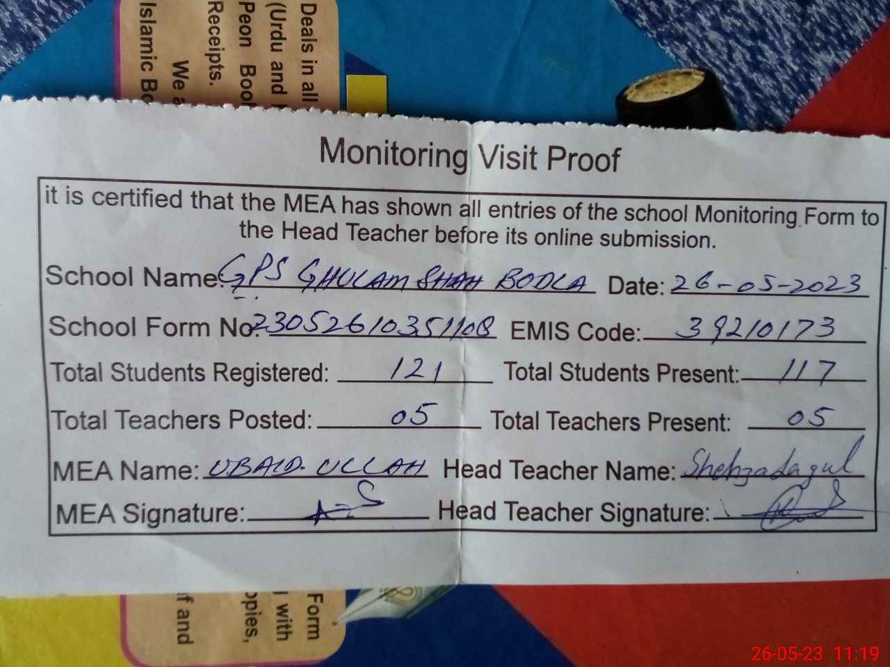 | Attendance Register | Head Teacher | MEA with School | Visit Proof |