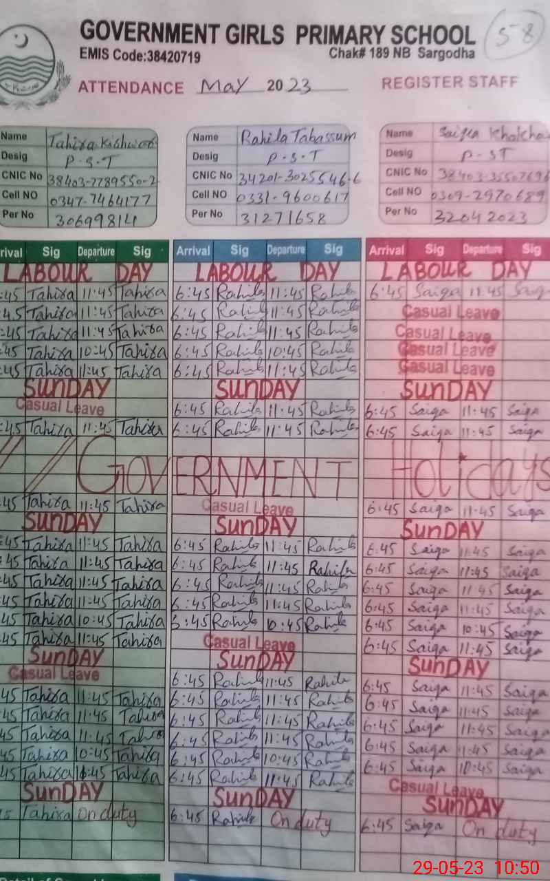 | CNIC | Full Name | Designation | R/C | Absence During Last Calender Month |
