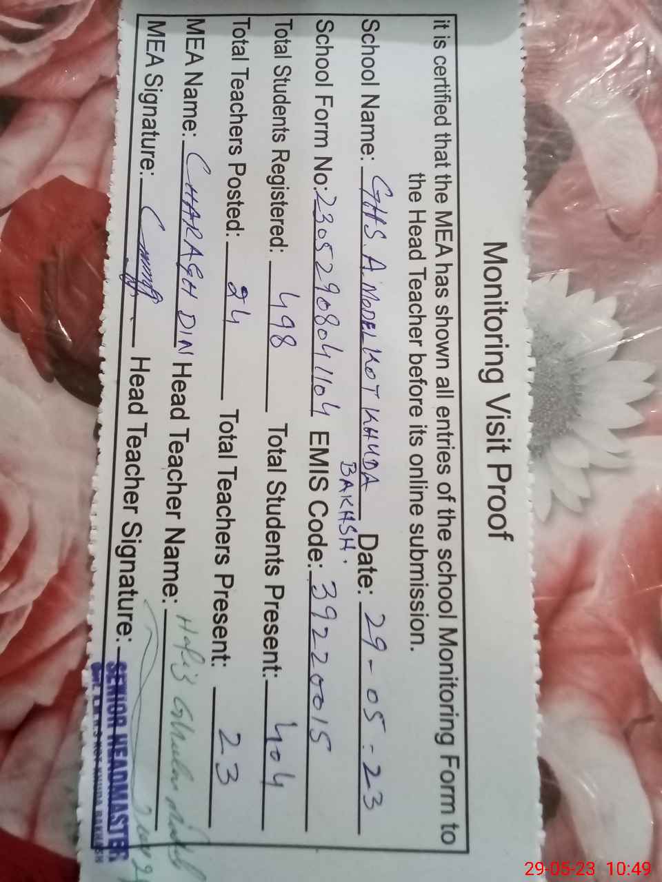 | Attendance Register | Head Teacher | MEA with School | Visit Proof |