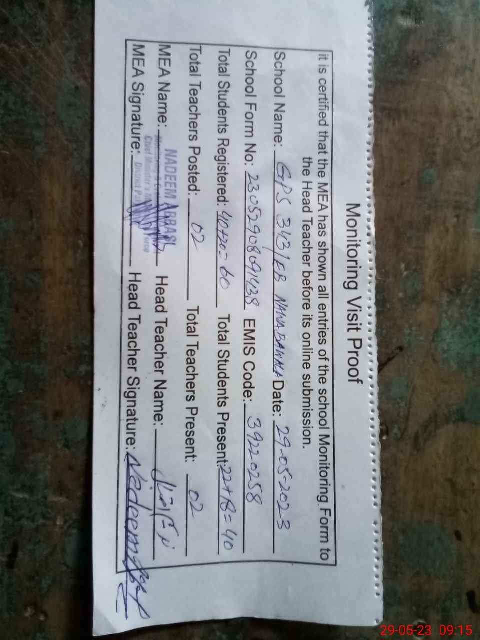 | Attendance Register | Head Teacher | MEA with School | Visit Proof |