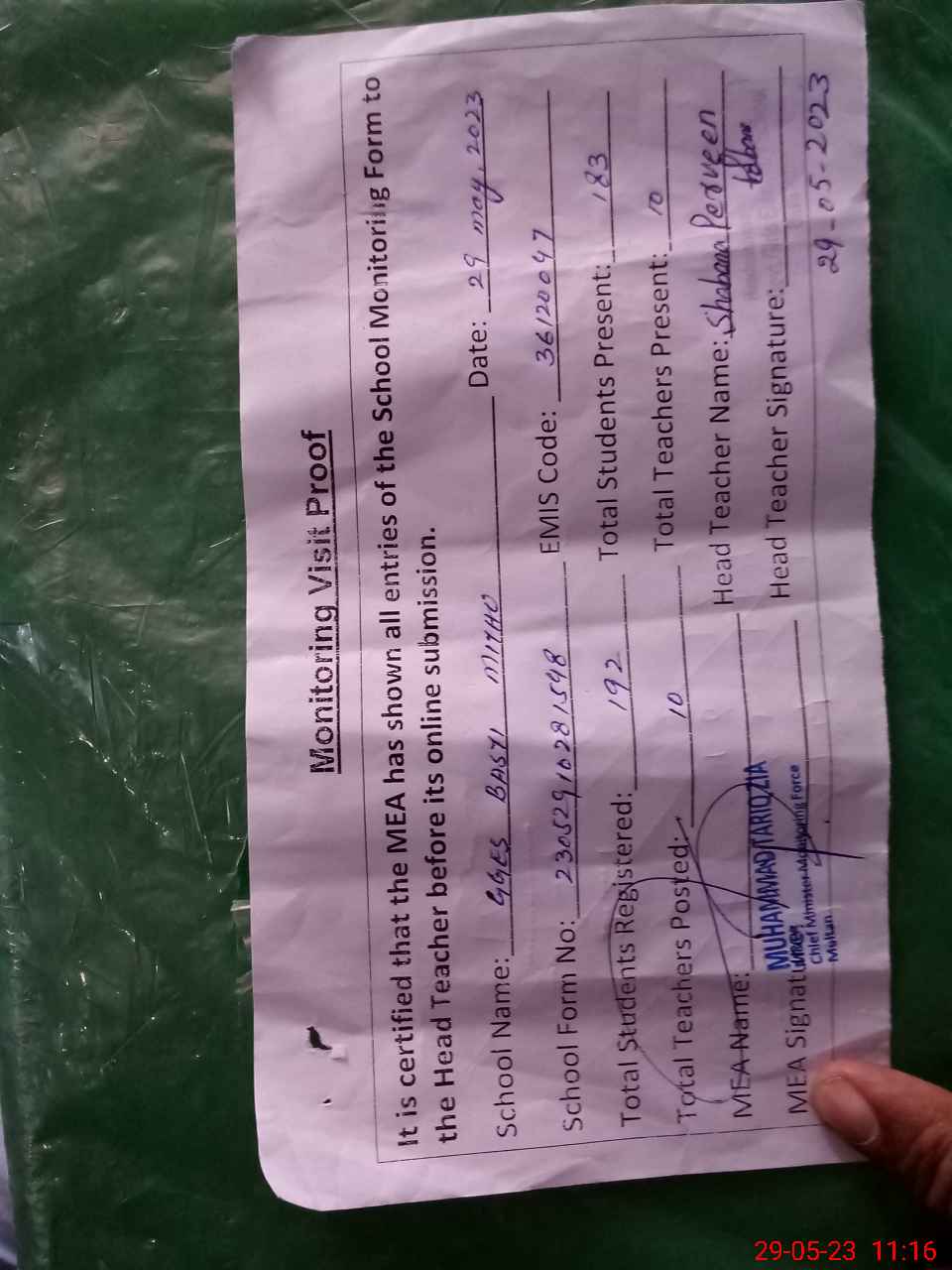 | Certified that this School was Inspected by the Undersigned MEA/DMO Today and the Information Stated Above is as Per Record. | |||||