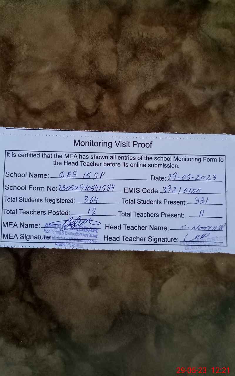 | EMIS Code: 39210100 | Name of School: GES 15/SP P.O PAKPATTAN | |||