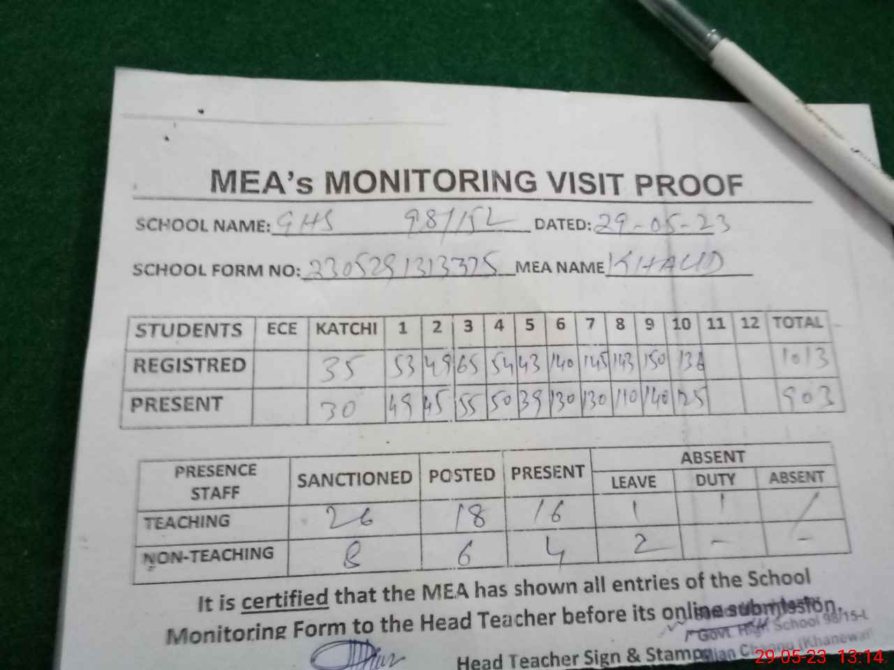 | Attendance Register | Head Teacher | MEA with School | Visit Proof |