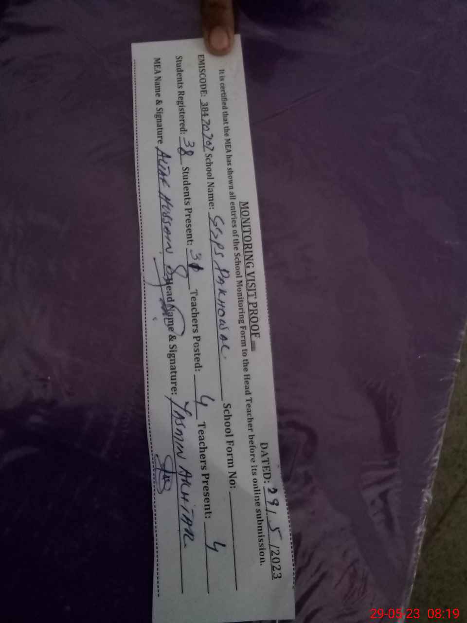 | Attendance Register | Head Teacher | MEA with School | Visit Proof |