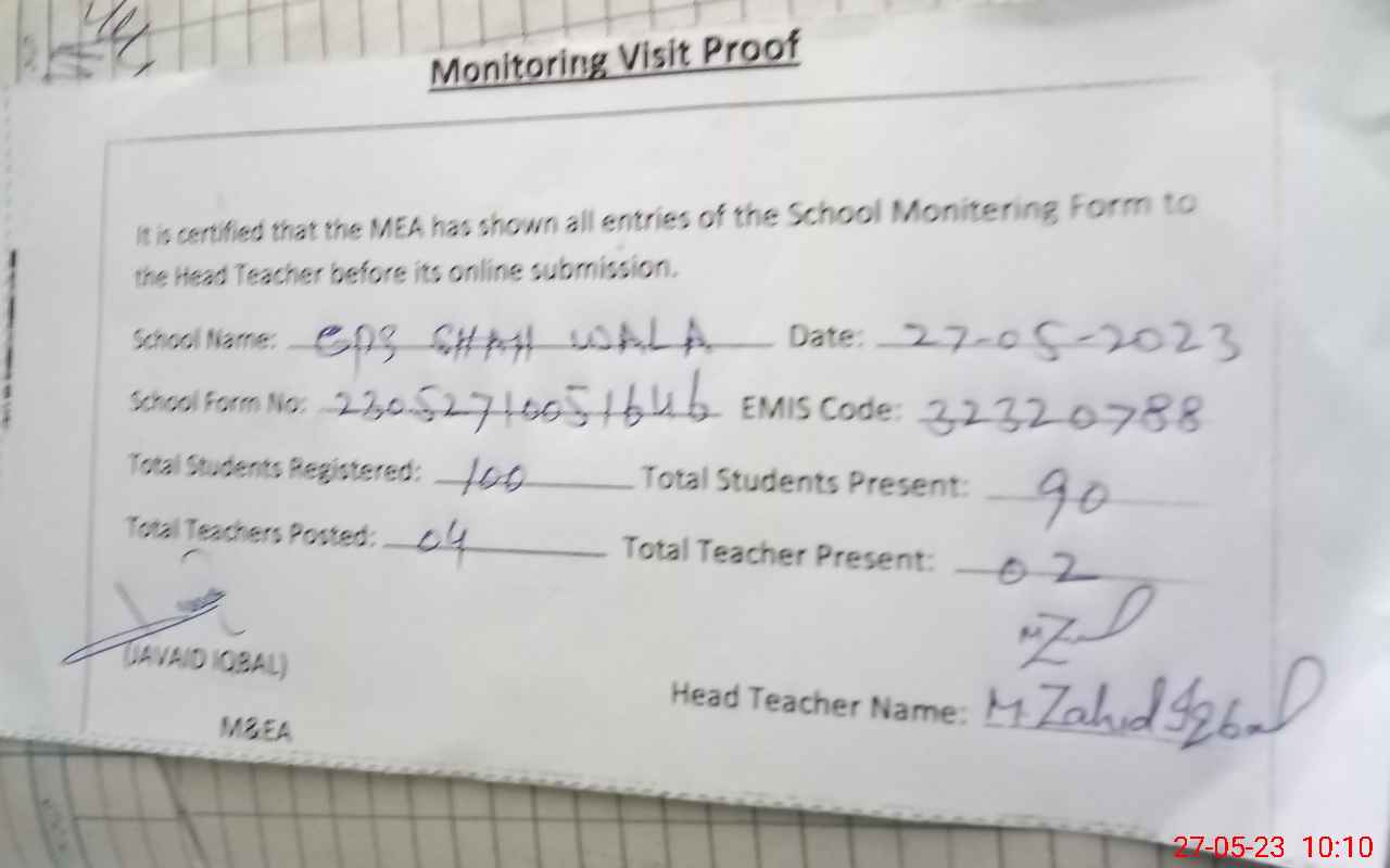 | EMIS Code: 32320788 | Name of School: GPS SHAH WALA | |||