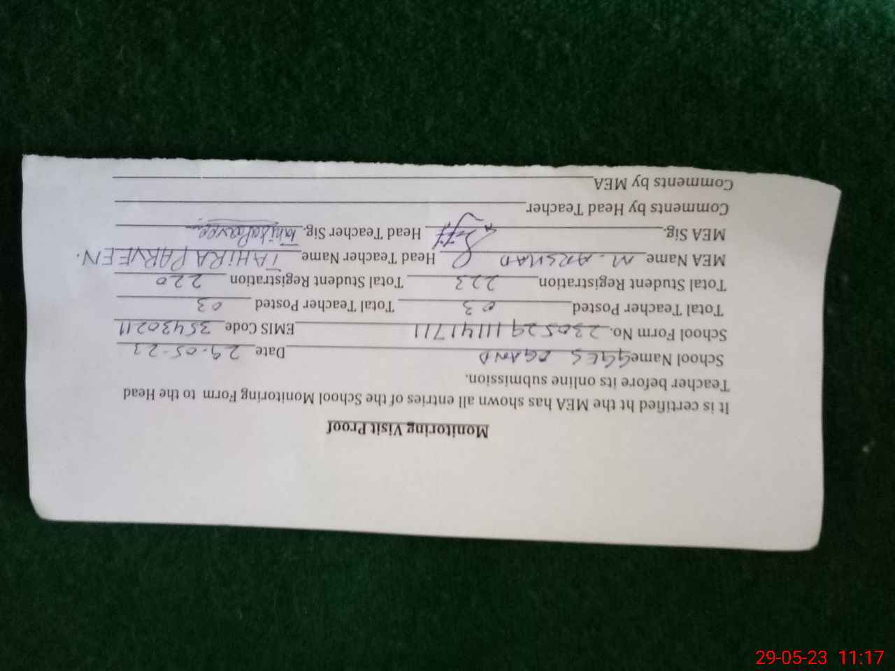 | Attendance Register | Head Teacher | MEA with School | Visit Proof |