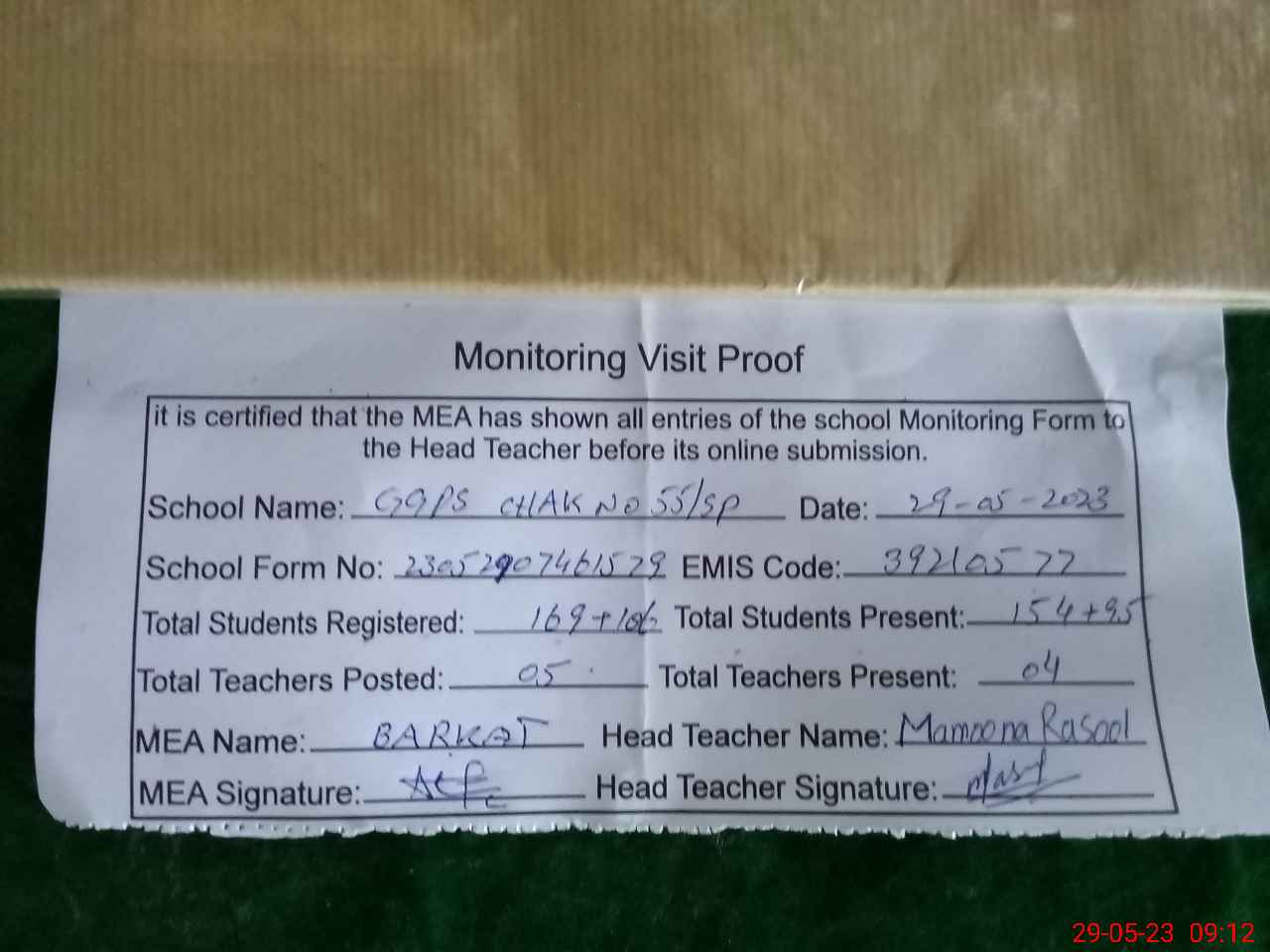| Attendance Register | Head Teacher | MEA with School | Visit Proof |