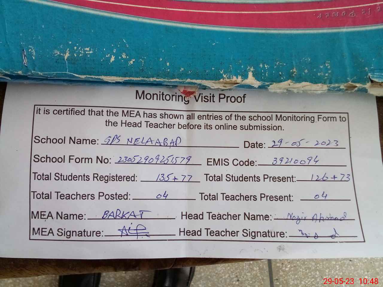 | Attendance Register | Head Teacher | MEA with School | Visit Proof |