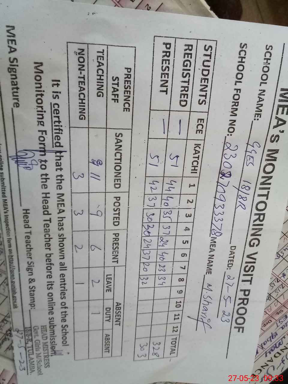 | Attendance Register | Head Teacher | MEA with School | Visit Proof |